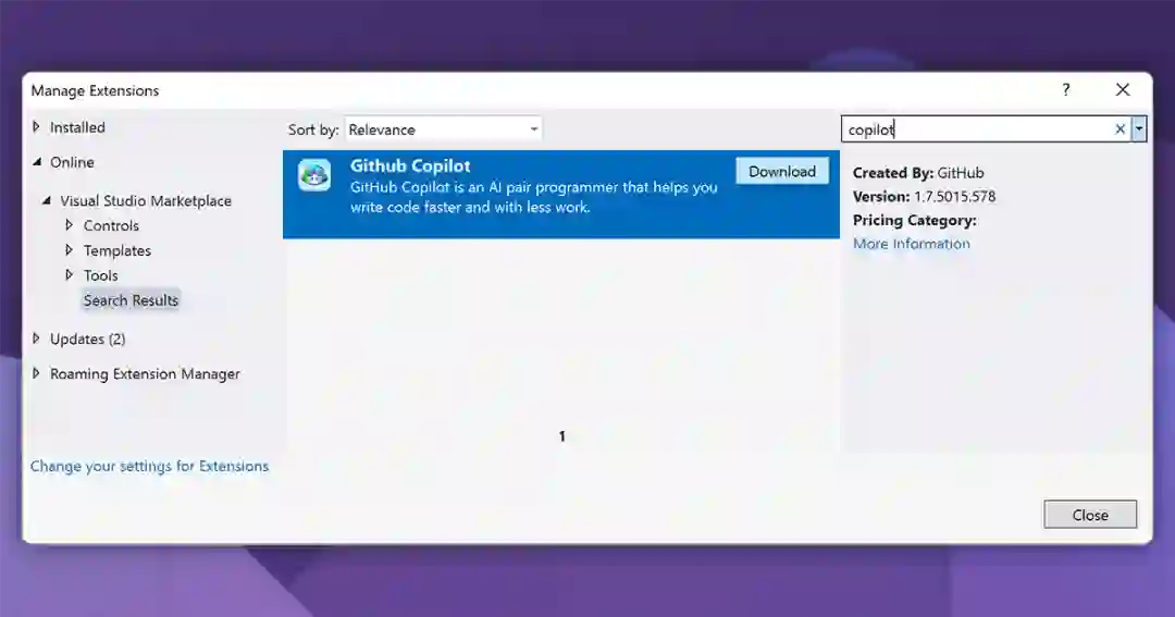 在收到来自 GitHub 的电子邮件后,证明你有访问权限,就可以进入 Visual Studio 2022 ,在 Extensions > Manage Extensions 中搜索 GitHub Copilot。