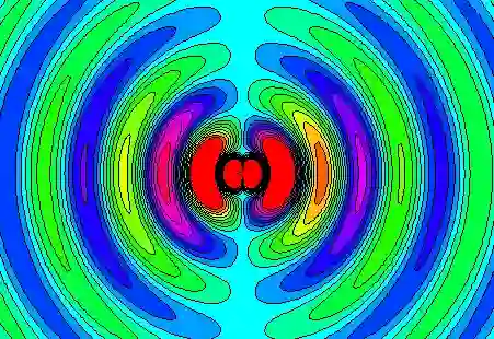 电偶极子两个电荷在做周期性往复运动,产生的电场如图所示,在不断向外发射电磁波