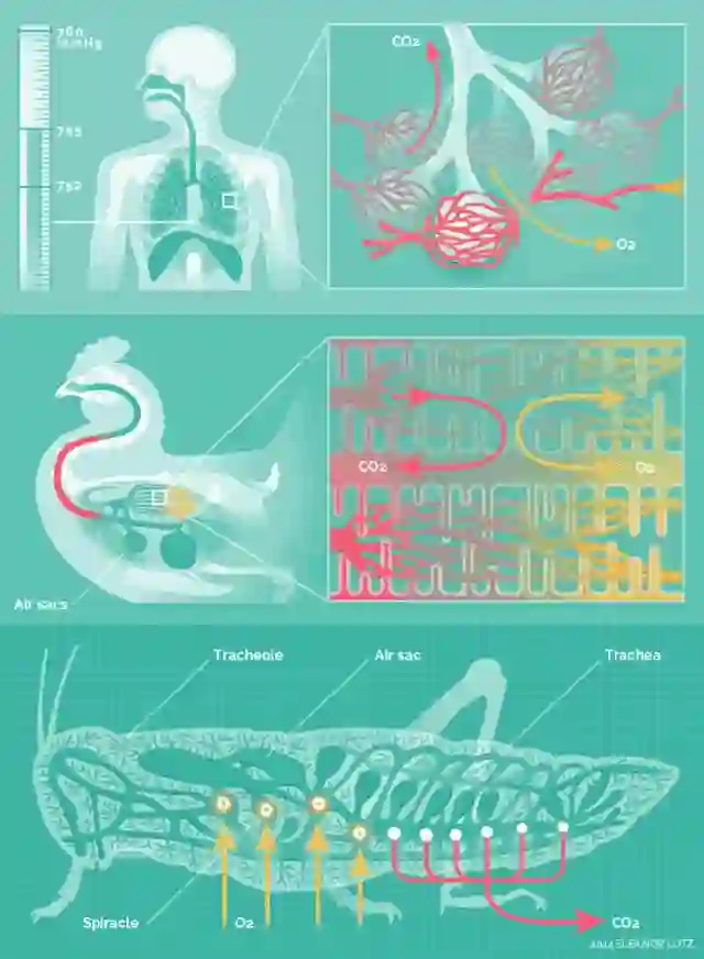 上图描绘了人,鸡以及蟋蟀三者之间迥异的呼吸系统