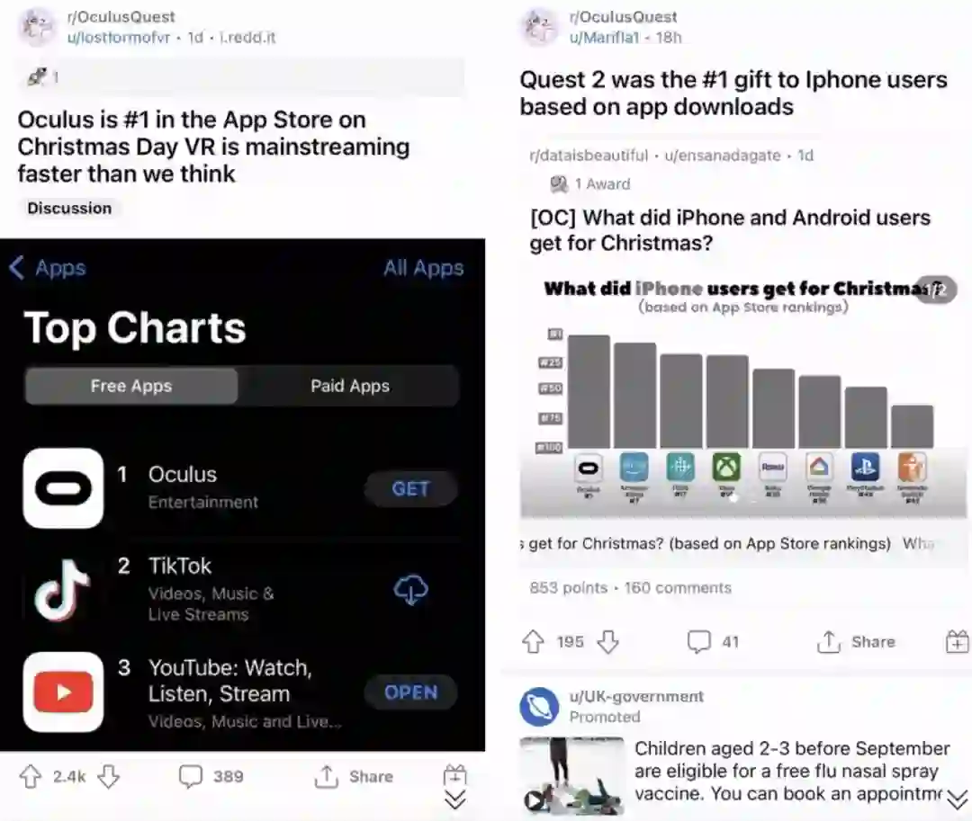 数据显示,Oculus应用在圣诞节当天在美国App Store下载榜登上榜首,其下载量超过TikTok。与此同时,Oculus Quest 2也成为这个圣诞节最受欢迎的礼物,超过Xbox和PS。