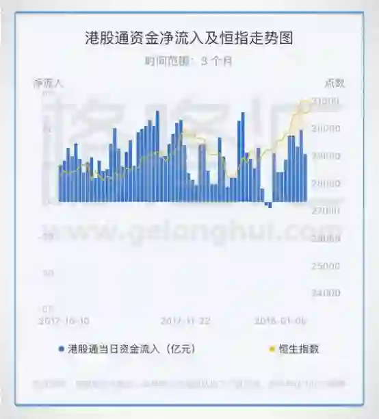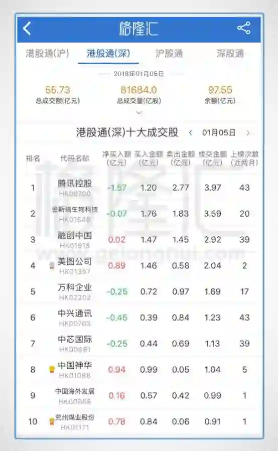 今日港股通自己共计净流入26.6亿元。龙虎榜数据显示,今日港股通(沪)前十大成交个股是融创中国、中国平安、新华保险、腾讯控股、建设银行、华润啤酒、中国太平、中国石油化工股份、美图公司、吉利汽车。其中净流入最多的个股是融创中国,净流入2.56亿港元;净流出最多的个股是建设银行,净流出2.58亿港元。