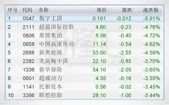 今日港股通标的中跌幅前五的个股是数字王国(00547.HK)、超盈国际控股(02111.HK)、惠理集团(00806.HK)、中国高速传动(00658.HK)、新奥能源(02688.HK)。
