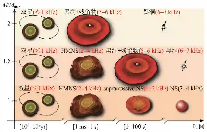 图1 质量相近两颗中子星并合的三种不同结局。横坐标是时间,纵坐标是以极限重量Mmax为单位的双星总质量。总质量远大于极限质量的双星系统并合后直接坍缩为黑洞(上图);总质量与极限质量相当的系统并合后新形成的中子星将经历较差转动阶段(即超大质量中子星HMNS),之后成为依靠刚性转动而稳定存在的大质量中子星(Supramassive NS,下图);总质量介于这两者之间时,并合产物会在较差转动耗散之后坍缩为黑洞(中图)。每个阶段持续的特征时标在横轴下标识,典型的引力波频率由图中括号内的红色数字标注