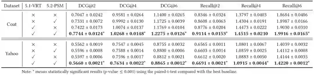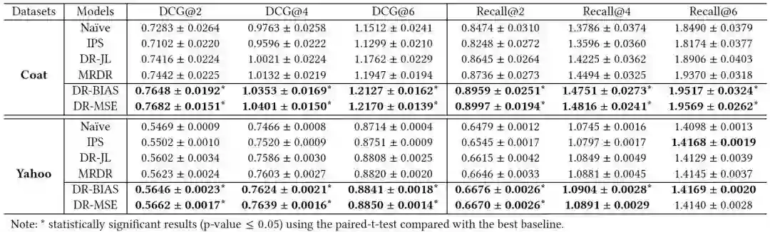 【在Coat和Yahoo!R3的MAR数据上,以MF为基模型,DCG@2,4,6和Recall@2,4,6的评价指标(最好的结果用黑体表示)】