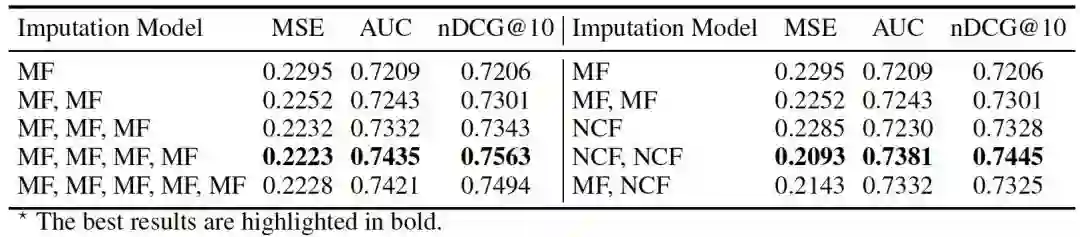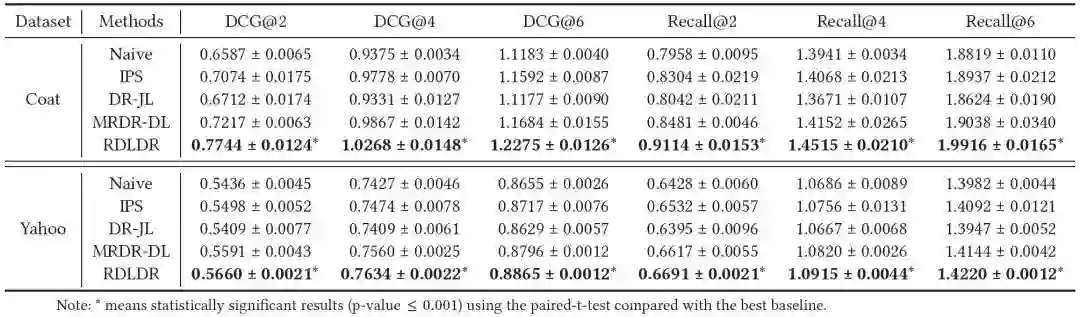 可以被适当地推断。这促使我们提出了一个两阶段的去偏框架,其中包括治疗的推断阶段和去偏阶段。治疗的归纳是一个单类的分类问题,我们利用在这一领域被广泛使用的SVDD方法。对于去偏阶段,除了直接应用以前用于显性反馈的去偏方法外,我们还考虑了未观测混杂的存在,这在隐性反馈中还没有研究过。重要的是,所提出的框架提供了一个灵活的范式,将显性反馈中的去偏方法与隐性反馈中的去偏方法无缝连接。例如,我们可以将显性反馈中的DR去偏方法应用于隐性反馈。