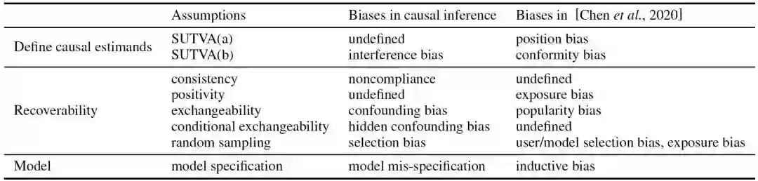 然而,一个统一的因果分析框架还没有建立起来。一方面,现有的推荐系统的因果分析方法对感兴趣的科学问题缺乏明确的因果和数学表述,导致该领域普遍存在许多模糊的因果概念,阻碍了因果推荐方法的发展。需要澄清许多混乱的问题:到底是什么被估计,为了什么目的,在什么情况下,通过什么技术,在什么合理的假设下。另一方面,推荐系统的观察数据的一个明显特征是存在各种偏差,这是得出因果结论的主要障碍。然而,推荐系统中偏差的正式因果定义仍然不明确,尽管各种偏差已经被发现并以描述性的方式提出。由于缺乏对因果问题和偏差类型的正式阐述,很难清楚地讨论去偏方法的理论属性、优点和缺点。也很难清楚地解释这些方法背后的假设。因此,很难开发新的去偏算法。