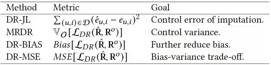 尽管DR方法通常与EIB和IPS估计器相比更有优势,但仍有一些担忧。通过对DR估计器的理论分析表明:偏差、方差和泛化界都取决于由倾向得分的倒数加权的误差推断模型的误差偏离。这是一个令人担忧的结果,因为在未点击的事件中,倾向于使用大的倾向性加权,而由于选择偏差和数据稀少,误差推断模型的误差偏差在未点击的事件中很可能是不准确的。这表明,在未点击事件中,在不准确的推断误差下,偏差、方差和泛化边界可能仍然很大。最近,一些方法,主要包括双重稳健联合学习