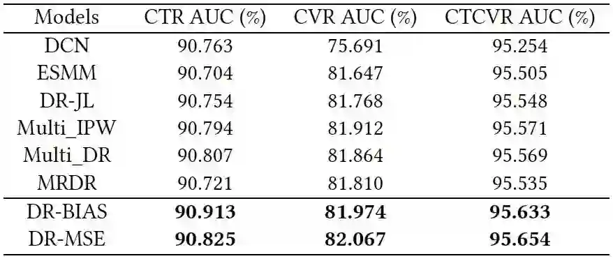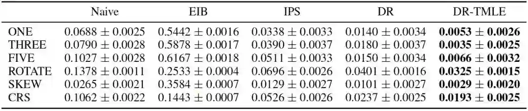 估计器。一个DR估计器将具有双稳健的特性,如果推断误差或倾向性得分都是准确的,它可以保证对CVR的无偏估计。与EIB和IPS方法相比,DR方法在总体上有更好的表现。