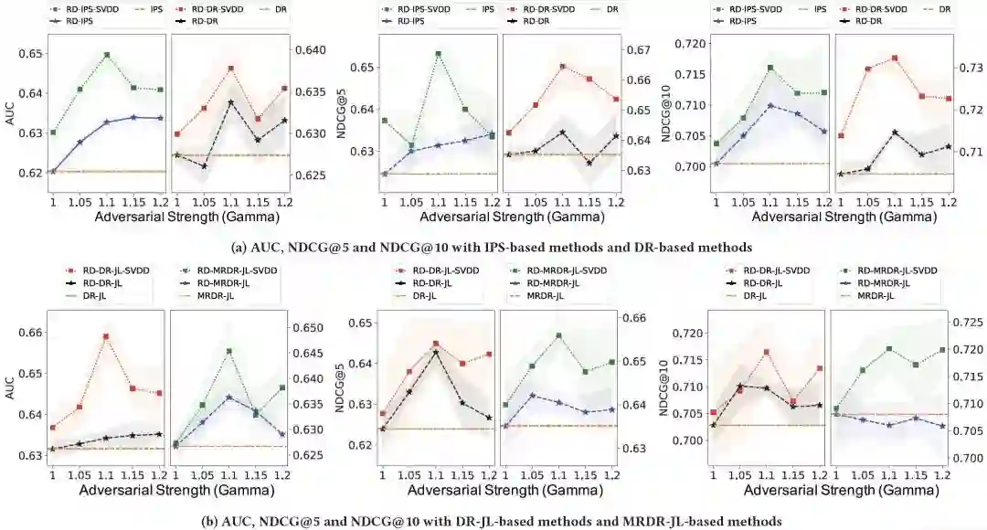 图题:在MAR数据上,不同对抗强度的AUC、NDCG@5和NDCG@10。上面是IPS和DR方法,下面是基于DR和MRDR的联合学习方法。