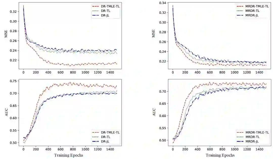 ,基于我们的分析,与现有基于DR的方法相比,DR-MSE实现了更好的泛化性能。此外,我们还提出了一种新的三级联合学习优化方法,用于在CVR预测中实现灵活的DR-MSE,并提出了相应的高效训练算法。我们进行了大量的实验来验证所提出的方法与最先进的技术相比的优势。在实验中,DR-MSE在DCG@2中优于存在研究方法的3.22%。