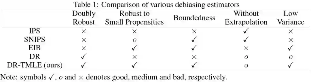 为了评估这些方法的性能,我们引入了五个角度来比较和评估推荐系统中的不同方法,包括双重稳健性、对小倾向的稳健性、有界性、无外推性和低方差。如果不能满足其中任何一个,都可能导致次优的性能。我们在这五个方面对各种估计器进行了比较,发现IPS、EIB和DR方法只享有其中几个理想统计特性。