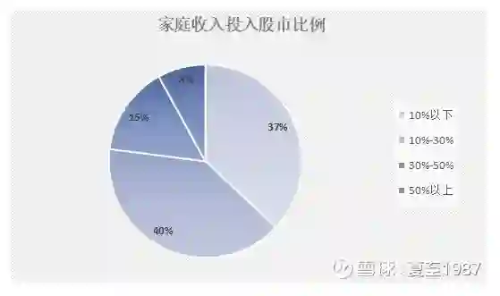 从上图数据来看,普通家庭用于投资股市的收入比例是很低的。30%以下比例的合计达到77%,10%以下的高达37%,说明大部分人还不太能接受股票投资这种资产配置的方式。