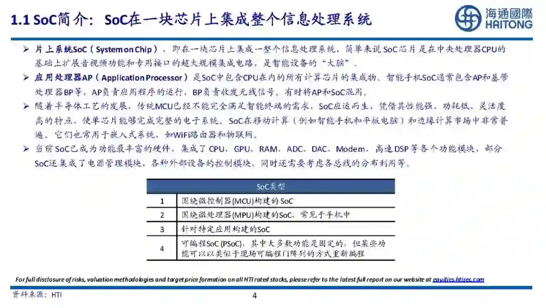 随着半导体工艺的发展,传统MCU已经不能完全满足智能终端的需求,SoC应运而生,凭借其性能强、功耗低、灵活度高的特点,使单芯片能够完成完整的电子系统。SoC在移动计算(例如智能手机和平板电脑)和边缘计算市场中非常普遍。它们也常用于嵌入式系统,如WiFi路由器和物联网。