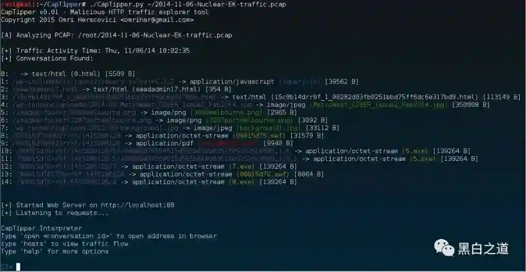 CapTipper设置一个Web服务器,其作用与PCAP文件中的服务器完全相同,并包含内部工具和强大的交互式控制台,用于分析和检查找到的主机,并且对话。