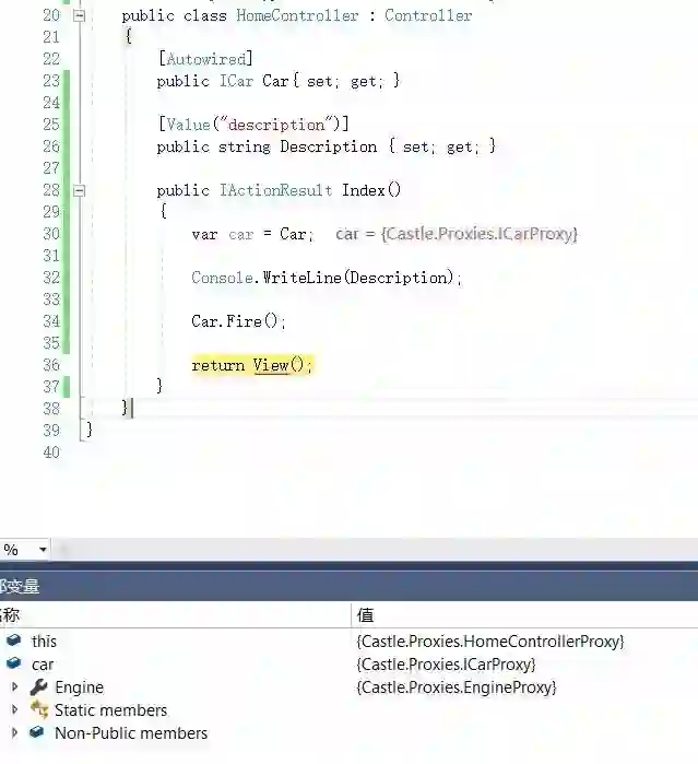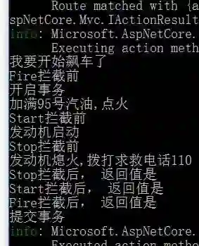 从上面代码我们可以看到,在addMvc后加上了我们替换默认控制器的AddSB方法,接管了控制器的生成。AddSbScoped<Engine>和AddSbScoped<ICar, Car>这种添加依赖注入的方式也保持了net core自带DI的原滋原味,简洁优雅,并且实现了动态代理,只需要在参数里添加拦截器,就能实时拦截,这里参数为params Type[],可以添加N个拦截器。
