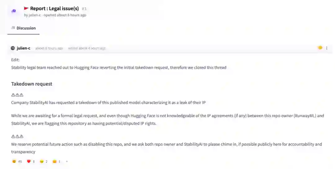在 Hugging Face 平台 Runway 发布的 Stable Diffusion v1.5 版本帖子上,Hugging Face 首席技术官 Julien Chaumond 提示了一个法律问题:Stability AI 法务团队要求 Hugging Face 删除发布的新版本 Stable Diffusion,且声称是侵犯知识版权。
