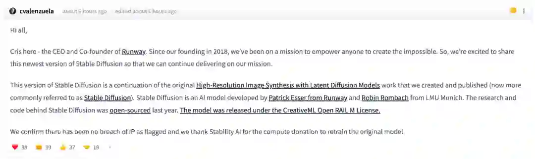 在大家迷惑的时候,Runway 的 CEO、联合创始人也下场解释了,表示自家发布 Stable Diffusion 1.5 版本是没问题的,是对「他们」创造、发布的原始研究的更新。此外,他再次强调了:这个研究的作者们来自 Runway ML 和慕尼黑大学,研究和代码去年也已经开源。