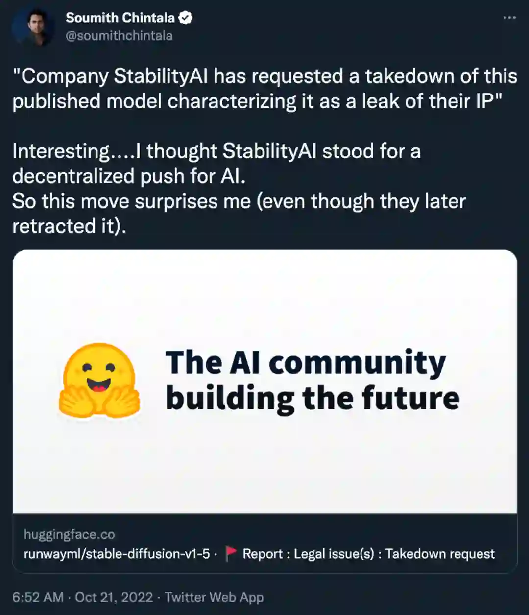 PyTorch 创始人 Soumith Chintala 也通过推特表明了自己的想法:「我一直以为 Stability AI 代表着人工智能的去中心化,所以这一举动让我感到惊讶。」