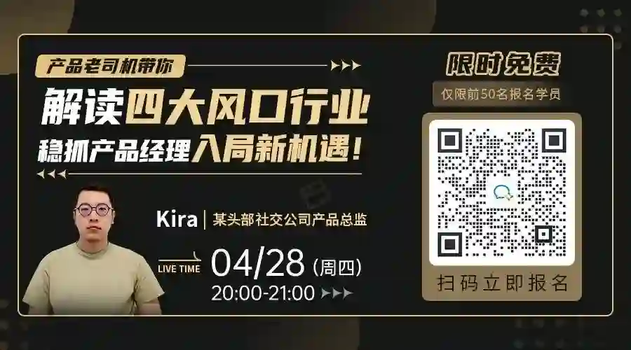 周四晚上8点,产品老司机—某头部社交公司产品总监@Kira 带你解读四大风口行业,稳抓产品经理入局新机遇!