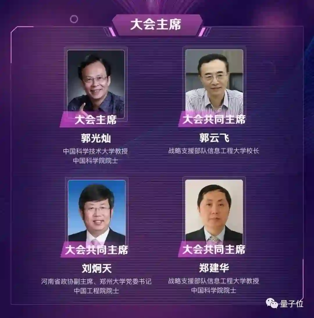 大会由CCF量子计算专业组主任、中国科学院院士郭光灿教授担任大会主席,大会共同主席为战略支援部队信息工程大学郭云飞校长,中国工程院院士、郑州大学党委书记刘炯天教授,以及中国科学院院士、战略支援部队信息工程大学郑建华教授。