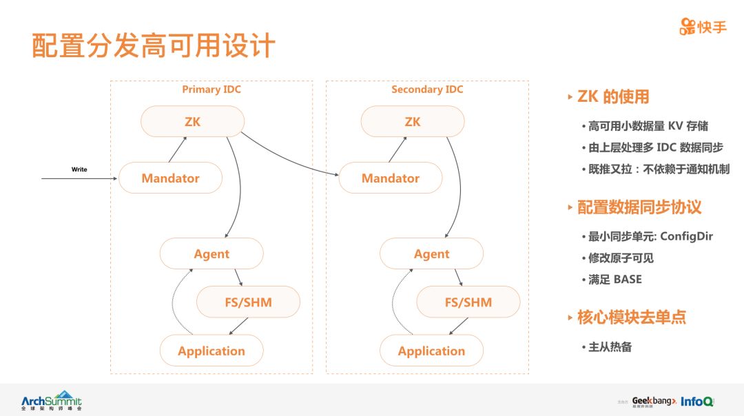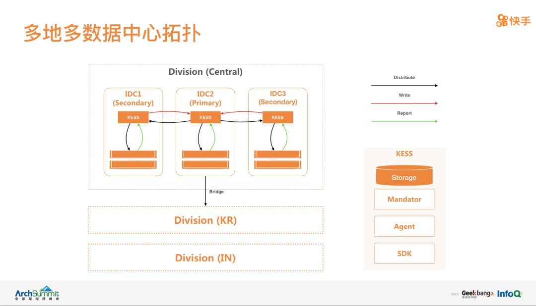 快手有国际化业务,把相对独立的国家和地区称作 division。比如图中 central division 是指国内的,另外还有韩国、印度等。在每一个 division 内部会有多个数据中心。其中有一个是主数据中心,其他的是从数据中心。KESS 负责从主数据中心到从数据中心的数据同步。主数据中心是全局配置唯一的可写入端。一旦主数据中心发生了灾难,可以将另一个可用的数据中心切换为主,在较短时间内恢复功能。这里比较核心的一个高可用设计,在于它的配置分发部分。