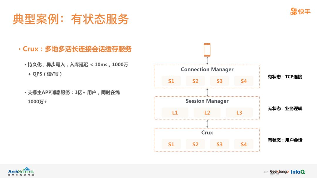一个典型案例,快手的私信服务,可以理解为是一个 IM 服务。这个服务管理了用户手机和快手服务之间的长连接。长连接就是一个状态,长连接建立好之后还会有一个用户会话数据,这也是状态。一旦服务重启,这些状态就会丢失,用户就会掉线,虽然可以在客户端做一些 cover,但不是特别理想。
