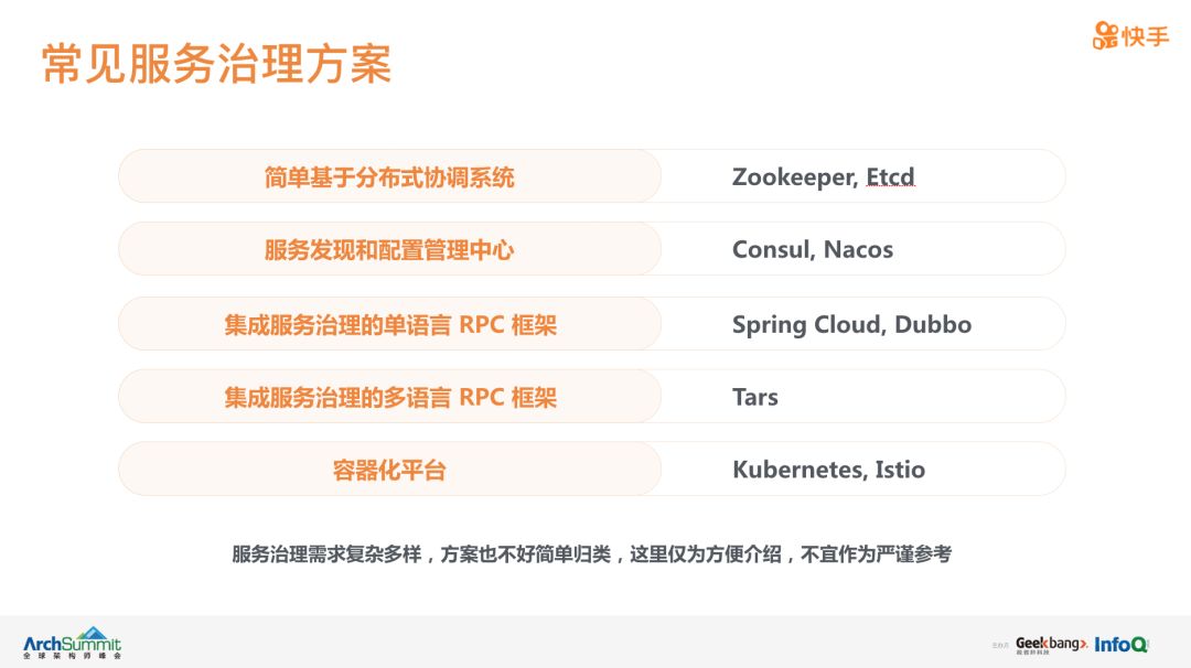 常见的开源方案有很多,为了方便比较,快手把常见的服务治理方案从需求出发做了一个简单的分类。
