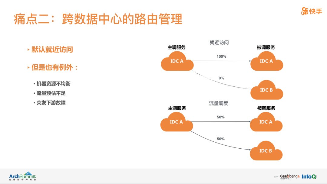 对于多数据中心部署的服务,通常是需要就近访问的,一方面能保证低延迟,另一方面也能减少专线故障对可用性的影响。但也有一些例外,比如说机器资源可能不均衡。在快手,因为业务规模扩张太快,经常出现某个数据中心机器资源紧张的情况。一些服务在特定数据中心没有机器可以部署,就近访问就会失败。另外,在节假日,用户访问量通常会增长,需要提前估算流量安排机器扩容,但估算可能会不足。