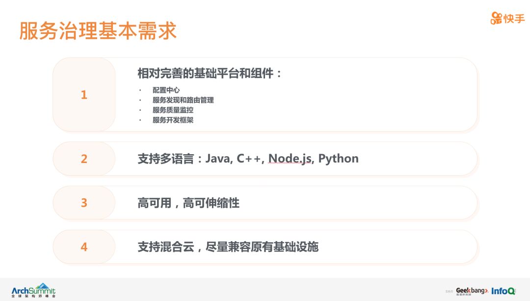这里列出了服务治理的几个基本要求。首先要有完善的基础平台和组件,包括配置中心,服务发现、监控平台,以及服务开发框架。第二,支持多语言,因为快手的业务特点,主要使用的语言有 Java 和 C++,还有少量业务会使用 Node.js、Python。第三,高可用、高可伸缩性。第四,快手的服务原来主要部署在物理机和虚拟机上,现在又增加了容器化部署平台,需要兼容所有的部署平台。