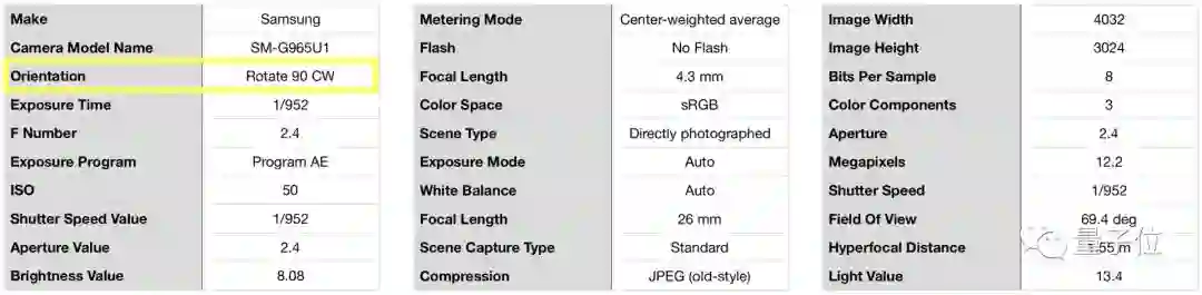 Exif中包含着照片的像素数、焦距、光圈等信息,其中还有一个方向(Orientation)的数据。