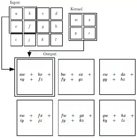 举个例子如下:图中的输入是一个二维的3x4的矩阵,而卷积核是一个2x2的矩阵。这里我们假设卷积是一次移动一个像素来卷积的,那么首先我们对输入的左上角2x2局部和卷积核卷积,即各个位置的元素相乘再相加,得到的输出矩阵S的S00的元素,值为aw+bx+ey+fz。接着我们将输入的局部向右平移一个像素,现在是(b,c,f,g)四个元素构成的矩阵和卷积核来卷积,这样我们得到了输出矩阵S的S01的元素,同样的方法,我们可以得到输出矩阵S的S02,S10,S11,S12的元素。