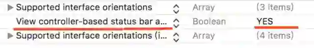 3.1、info.plist文件中,View controller-based status bar appearance项设为YES,则View controller对status bar的设置优先级高于application的设置。
