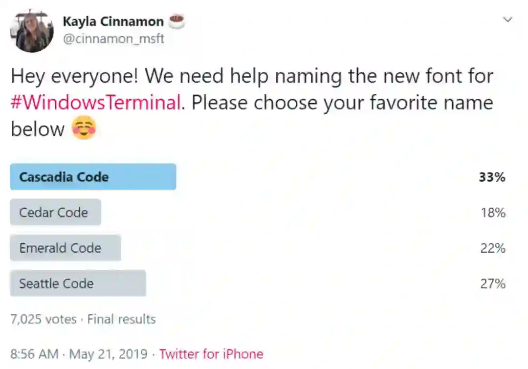 另外,微软此前还发起了为该字体名字投票的活动,最终“Cascadia Code”胜出。