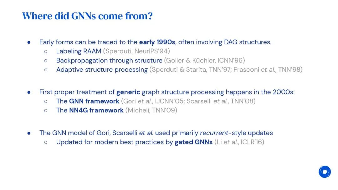 但是,什么是GNN呢? 快速在线搜索可以发现许多不同的定义。根据作者所假设的背景,这些定义可能大相径庭(甚至使用完全不同的术语)。这并非巧合:我们现在所认为的图神经网络的概念,都是在过去十年里从各种机器学习方向独立出现的。
