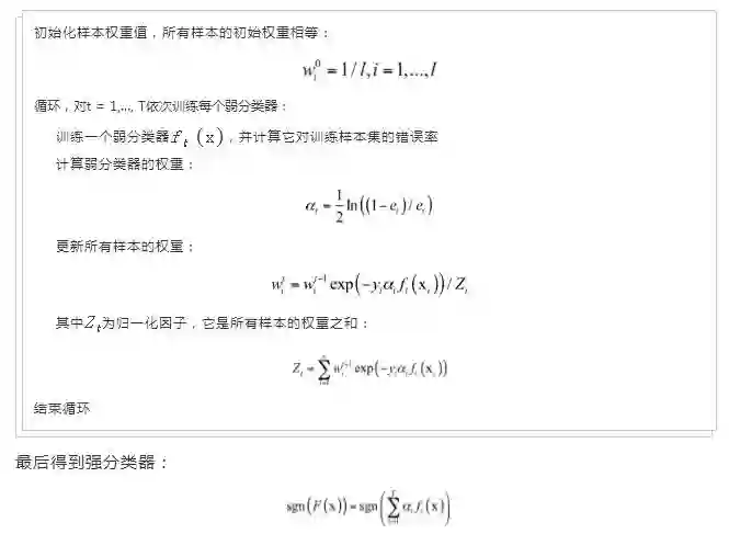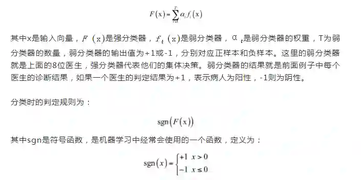 后面的过程和前面类似,依次训练孙大夫,李大夫,周大夫,吴大夫,郑大夫,王大夫,每个大夫在学习的时候重点关注被前面的大夫误诊的病例,学习完之后调整每条病例的权重。这样到最后,王大夫对前面这些大夫都误诊的病例特别擅长,专攻这些情况的疑难杂症!