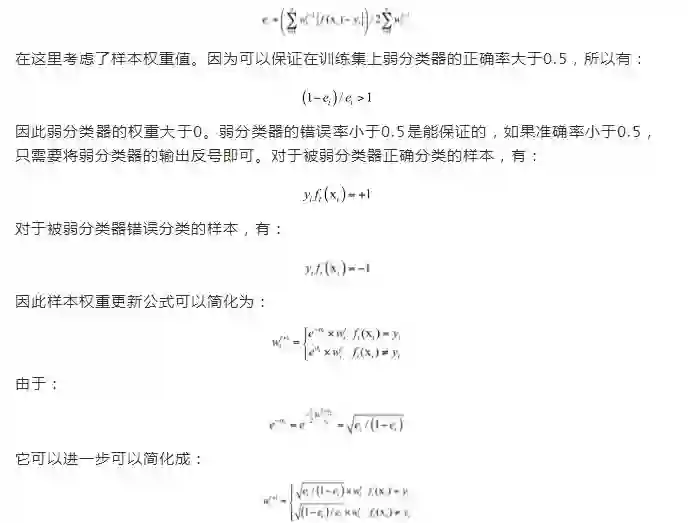 根据计算公式,错误率低的弱分类器权重大,它是准确率的增函数。沿用医生集体会诊的例子,如果在之前的诊断中医生的技术更好,对病人情况的判断更准确,那么可以加大他在此次会诊时说话的分量即权重。弱分类器在训练样本集上的错误率计算公式为: