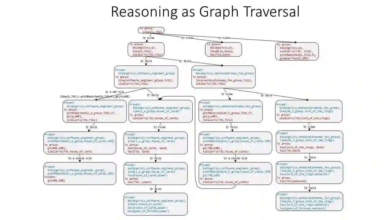 当然,并不是所有的规则推理最后都能够被所有的事实来支撑,比如说最左边的这个叶子结点,它有一个红色的待证明项,是找不到事实支撑的,那么这整条路径就是失败的。但是我们在这个树里面,如果你的知识图谱足够丰富的话,它总可以找到某一个子路径,是可以证明当前这个推理的。