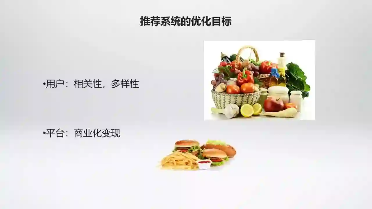 推荐系统的优化目标,如果从用户的偏好来讲,我们是希望提供给用户一个非常健康的组合,既符合他们的口味,又有足够的多样性,就是有营养的内容。但是平台本身呢,它又有商业变现的要求,所以有的时候为了平衡用户的需求和平台本身的需求,我们就要做出某种折中。也许我们不会提供像麦当劳这样的快餐,但是我们可能要为了获得一些短期的回报,在一个完全健康的食品和这种快餐之间取得某种折中。