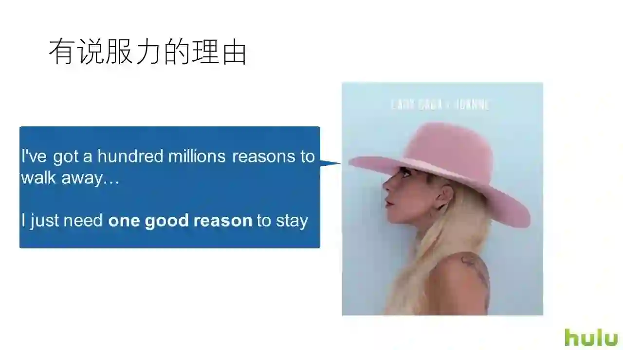 Lady Gaga有一首歌唱的是“我有一亿种理由离开,但是我只需要一个好的理由留下”。(彩蛋来啦,Bazinga!)那么对推荐系统来说,它可能推出完全相同的结果,但是如果我们可以给出一个好的理由,那么用户会对它的信任会更高,点击率也会相应提高。