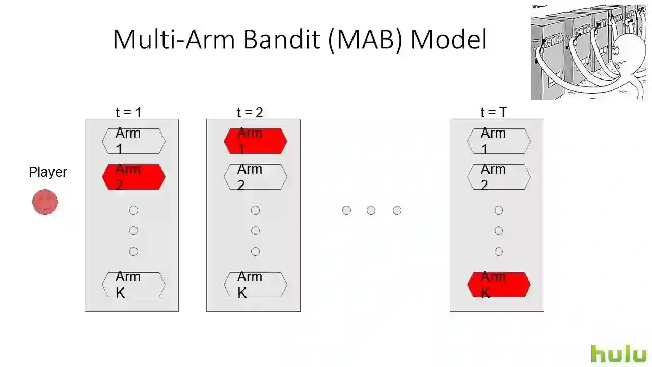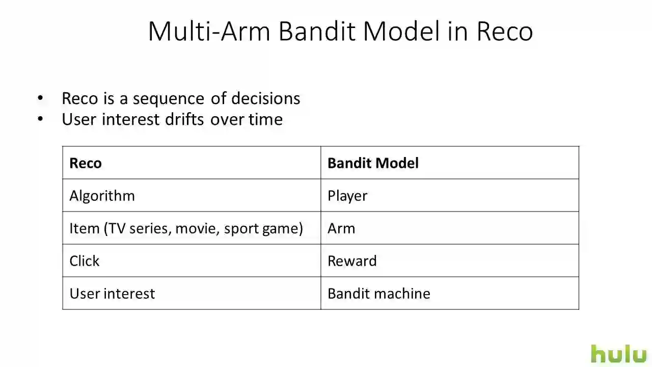 多臂老虎机是借用了赌场的一种场景。一个赌徒可以在不同的时间选择不同的摇臂,每个摇臂会给这个赌徒不同的赢率。如果赌徒每次都选择摇臂1的话,有可能不是最优的,因为可能另外一个摇臂的反馈更好。我们把赌场的场景应用到推荐系统里面,就是每个摇臂是我们可以推给用户的一个剧,而我们的算法就是这个赌徒,它通过一些策略来选择将哪个剧推给用户。而每个摇臂获得的奖励,就是用户是否点击和观看了。用户的兴趣本身就是这个老虎机自己的一些参数设定。
