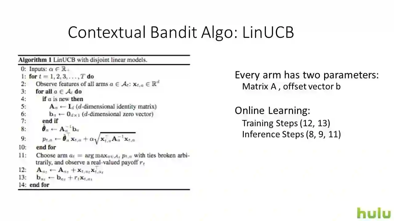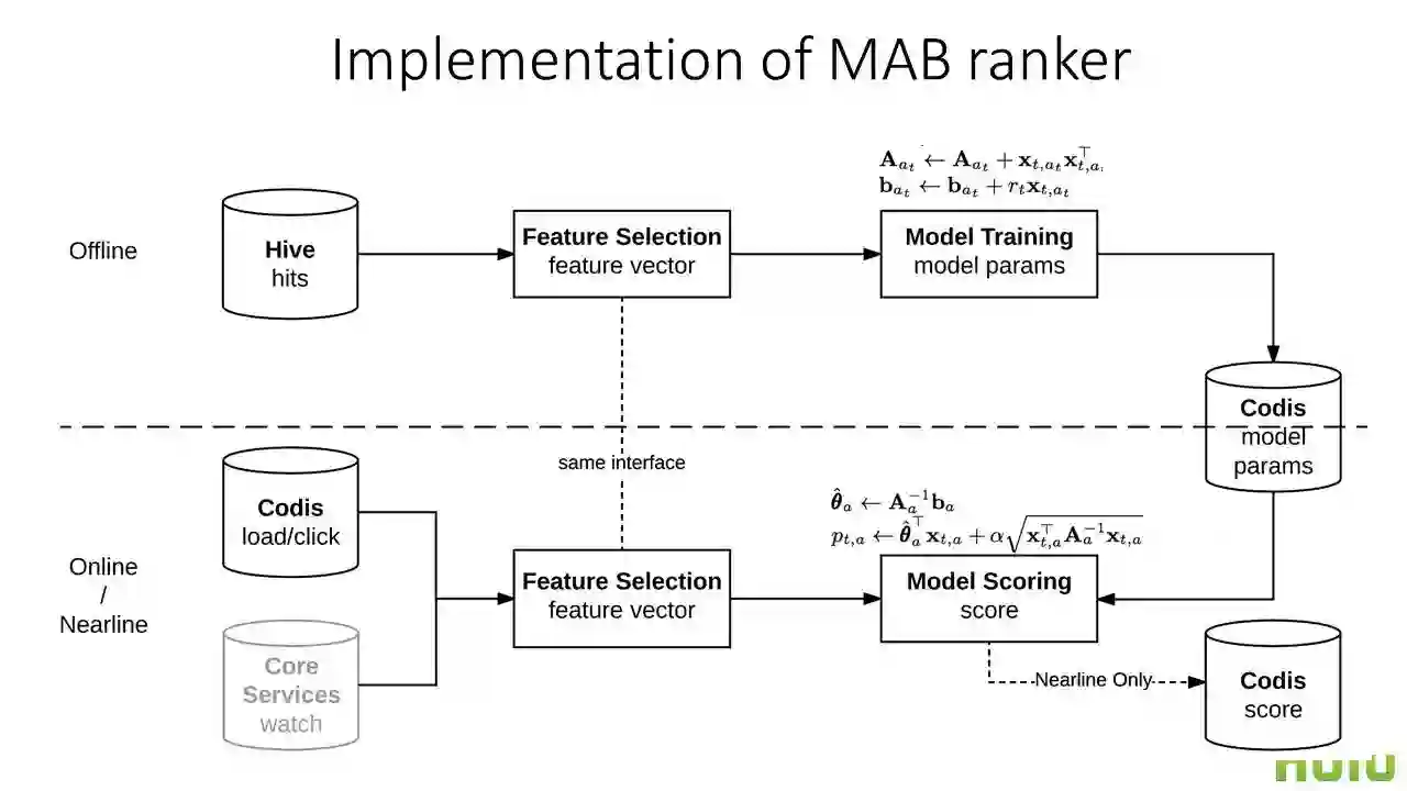 具体来讲,在线上部署LinUCB的算法,有一个线上更新提取特征以及模型运算的过程,以及一个线下根据之前模型采集到的信号去更新模型参数的过程。