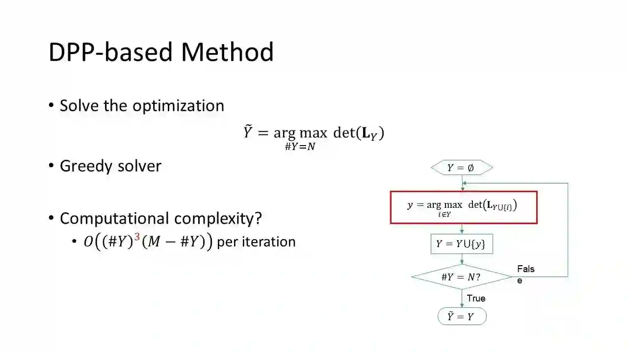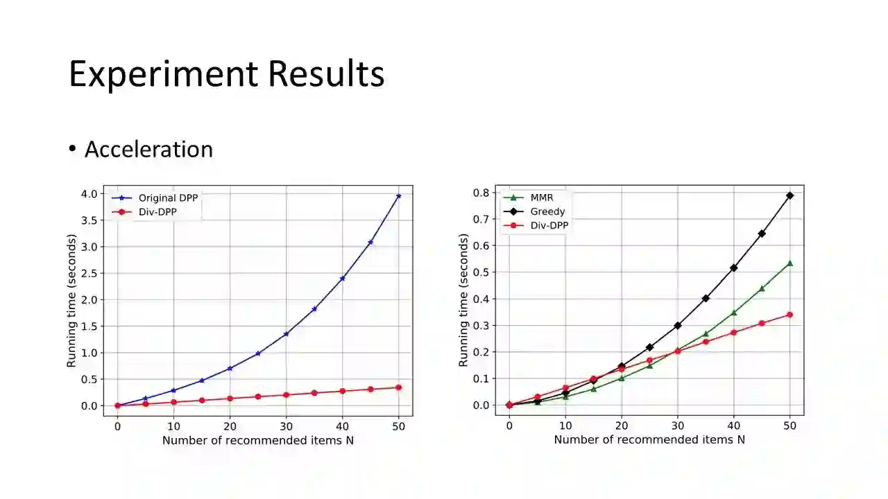 就是这个图里面画的这条红色的线,它可以和刚才讲的DPP的原始实现达到同样的精度。但是由于我们采用了incremental update的方法,有效地降低了计算复杂度,把原来Y的立方的这种计算复杂度变成了线性。