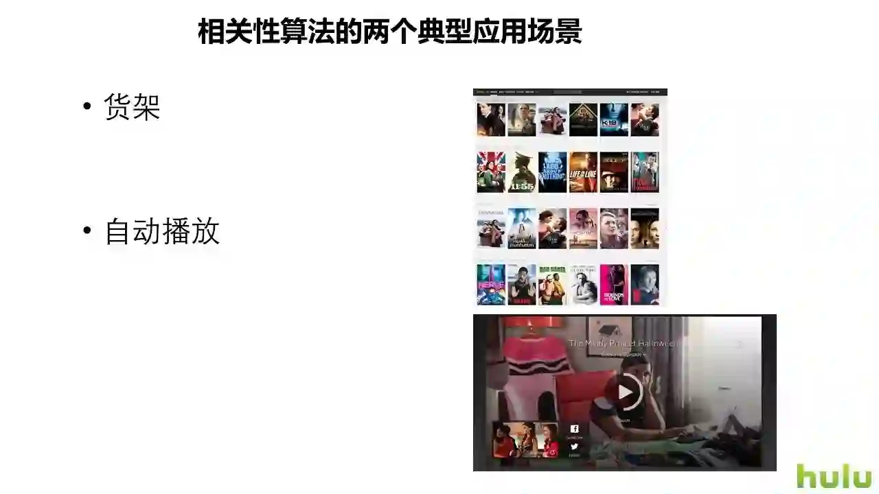 相关性算法有两个应用场景,一个是所谓的货架场景,就是给一个网格里面按照相关性做了排序,然后希望用户点越靠上越靠左的这些内容。另外一个是自动播放的场景,就是播完一个内容之后,我们会自动地开始下一个我们觉得用户最可能看的内容。对应这两种不同的场景,其实需要不同的相关运算。