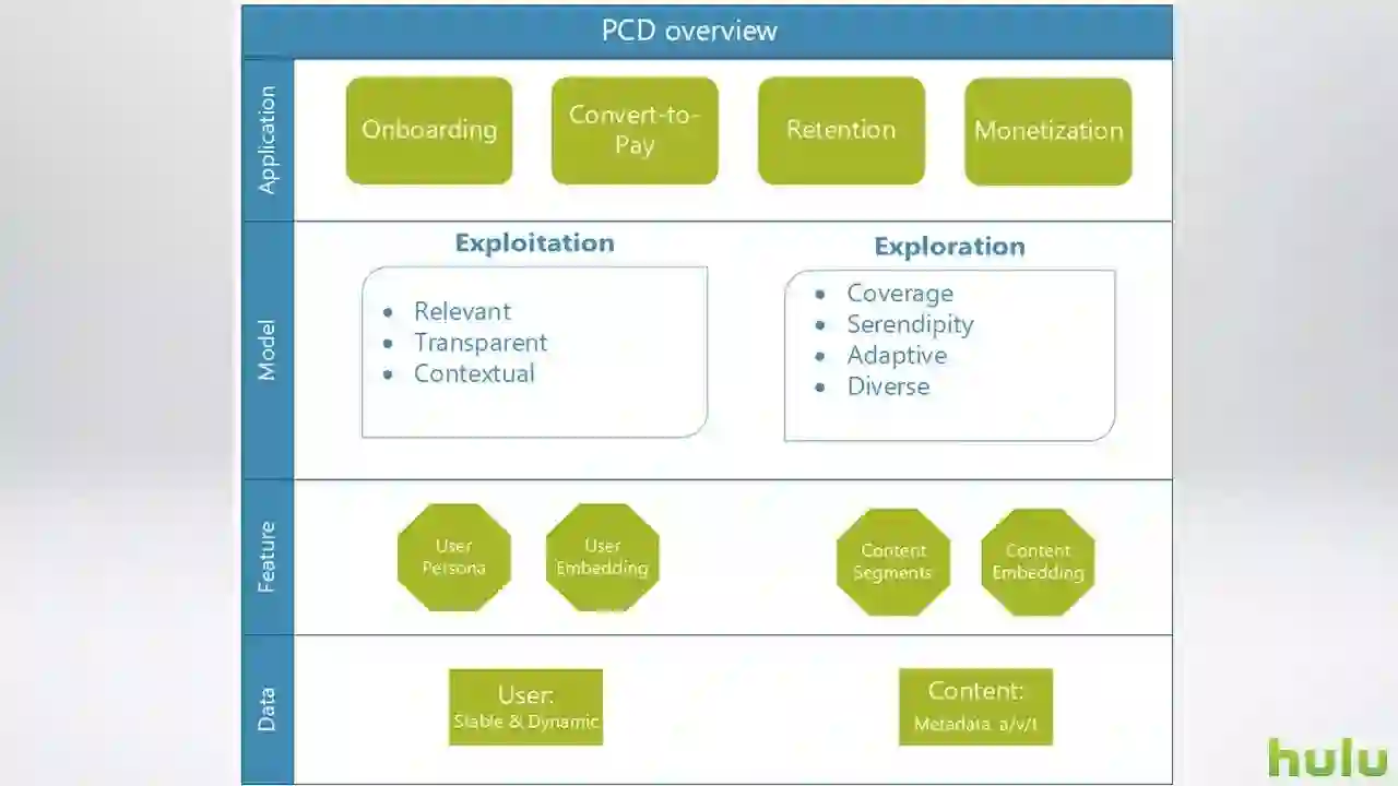 在模型之上,我们要做一些应用。这些应用主要是服务四个用户的阶段。首先是所谓Onborading,就是一个新用户,刚刚订阅我们的服务的时候,还在一个初始的、给我们一些信号的阶段。我们让用户选择他最喜欢的内容频道,然后用户会告诉我们他喜欢体育、喜剧或者动作片。基于这些大类,我们可以给他做一个冷启动,给他第一屏的推荐结果。