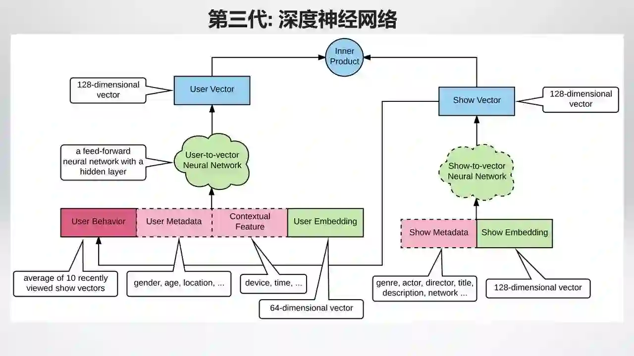 也就是,把原来矩阵分解里面代数运算的步骤,用一个前向神经网络来替换。这样的好处一方面是非线性前向神经网络允许一些非线性的映射,可以有更好的表达能力去model一个更复杂的分布。另外的一个好处就是我们可以直接把关于用户的除了行为之外的所有信息,用一个矢量feed到这个神经网络里面去。对内容我们也可以做相应的处理,就是把元数据,比如说导演、演员信息用一个向量来表示,然后把它feed到神经网络里面去。