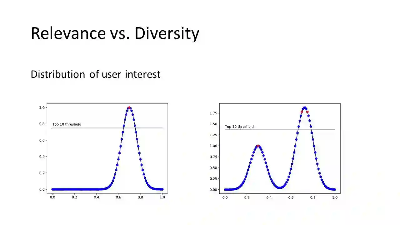 我们为什么要关注多样性?是因为用户的兴趣爱好可能不是单峰分布的。有可能用户有多个兴趣爱好,其中有非常突出的一个,就是这个比较高的右边的峰。但是还有一个比较低的,就是右边这张图里面的靠左的这个峰值。如果我们用简单的相关性排序的方法,就会把右边峰值里的很多内容都排在前面。而用户隐含的兴趣,就是左边这个比较矮的峰,就不会出现。所以我们要用一些多样性的策略,使得左边这个矮的峰里面的一些好的内容也会被推荐。