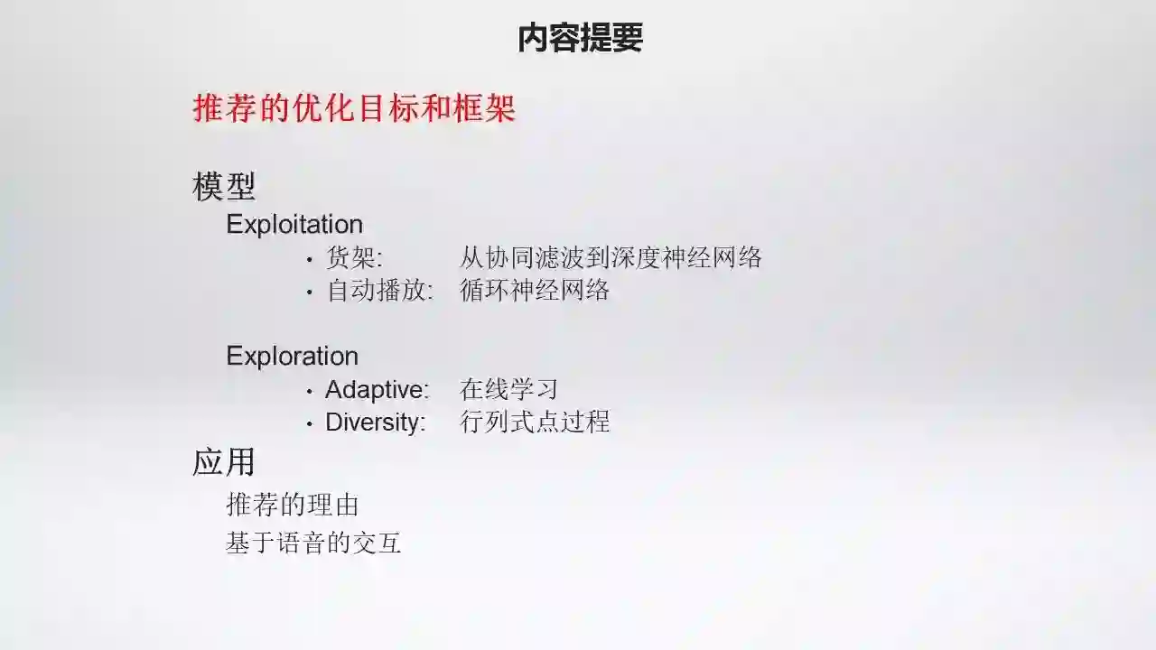 这个是我们今天课程的一个内容提要。第一,我会讲一下优化目标和框架,第二,模型。模型里面又包括Exploitation和Exploration的两种具体的模型。然后基于这个模型,我会讲两个应用场景。