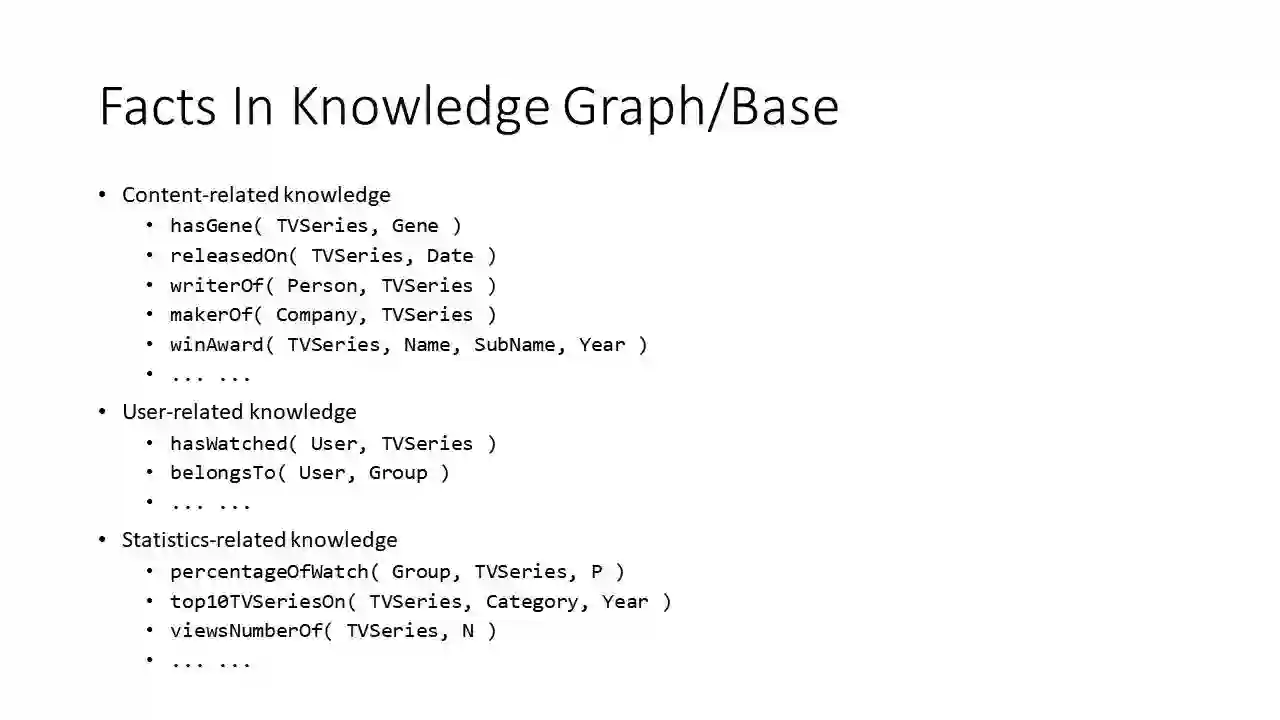 但是如果我们想做得更加人性化、更加自然,我们要用一种知识图谱的方法。在知识图谱里面构建内容,用户的群组,相关性的信息,以及一些统计信息,包括这个剧的流行程度,它在外面的排名。我们用一种N元组的方法来记录这个知识图谱。