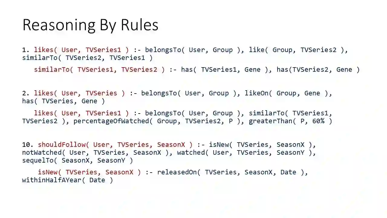 基于这个知识图谱,我们可以设定一些推理规则,每一条规则其实对应某一种经典算法,比如第一条规则,就是如果用户喜欢电视剧,一是由于他曾经看过电视剧,二是电视剧2和1非常相近,这就是item-based CF逻辑的一种表达方式。类似的话,我们还可以把user-based CF也用一条规则来表达。比如说这个地方列出的第二条规则,就是如果用户属于某一个群组,而这个群组里面60%的人都看过剧1,那就说明当前这个用户也可能会喜欢看剧1。