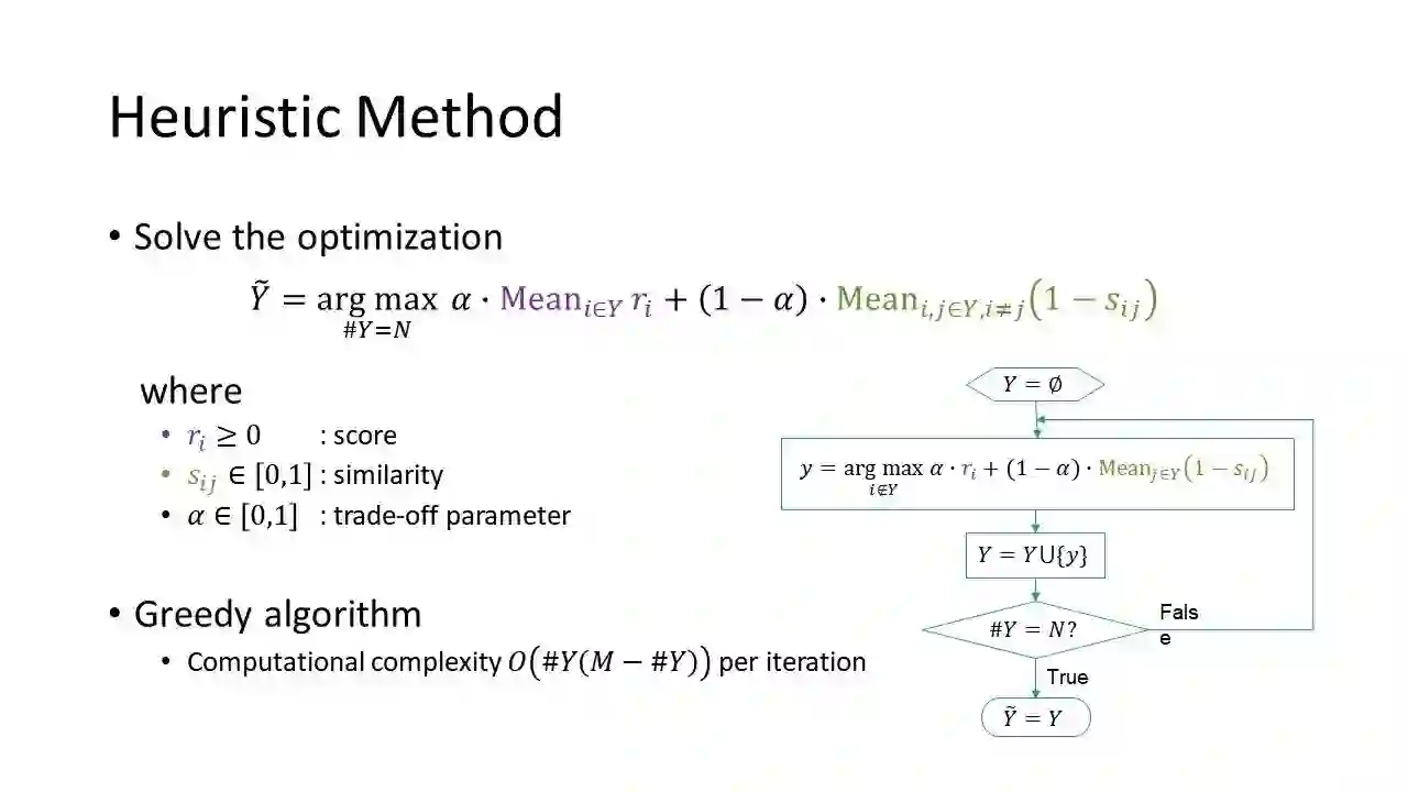 这种方法也有一种贪婪式的解,它的计算复杂度是选品总数的立方,比刚才的那个Heuristic,就是两两之间比较的话,它的计算复杂度要更高一些。所以为了解决这种更优的度量带来的计算复杂度的增加,我们用了一些代数的方法去加速,最终我们达成了一种线性复杂度的方法。